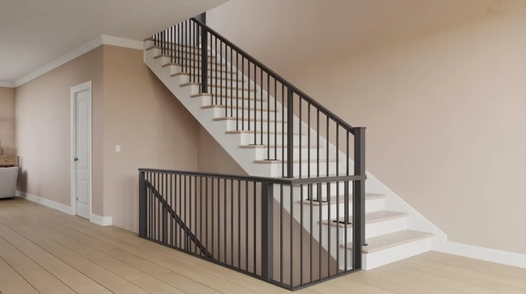 A black metal railing adds contrast and structure without overwhelming the space. It is especially popular in industrial, modern farmhouse, and contemporary homes. The crisp, dark lines instantly sharpen a staircase’s look and pair beautifully with wood, stone, or painted finishes. For homeowners searching for a trending aesthetic that still feels timeless, this is a strong choice. It also works well in both compact and spacious homes, adding definition without bulk.