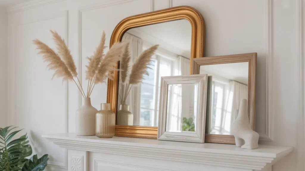 A layered mirror display can make your mantel feel larger, brighter, and more refined. Instead of using a single flat piece, lean a main mirror against the wall and place smaller framed accents in front. This approach adds depth and reflects natural light, which is perfect for a summer update. It is a great decor inspiration choice if you want something elegant and not too seasonal. This trending aesthetic works especially well in modern, transitional, and neutral room ideas where texture and shape matter more than bold color.