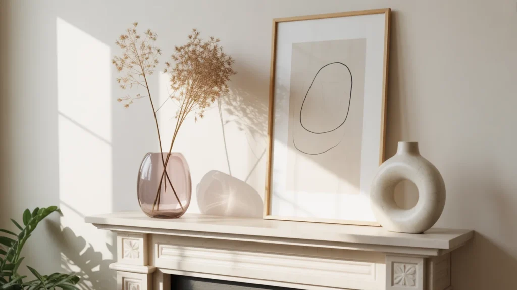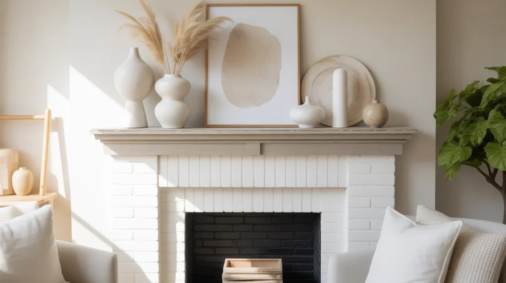 A neutral summer mantel proves that seasonal decor does not have to be colorful to feel fresh. Think sandy beige, warm white, pale taupe, soft wood, and subtle texture. This look is ideal if you love clean styling and want a trending aesthetic that feels calm and elevated. Add ceramic vessels, a textured frame, and light linen accents nearby to make the whole space feel intentional. These stylish ideas work especially well in modern farmhouse, Scandinavian, or minimalist room ideas where simplicity is the main focus.