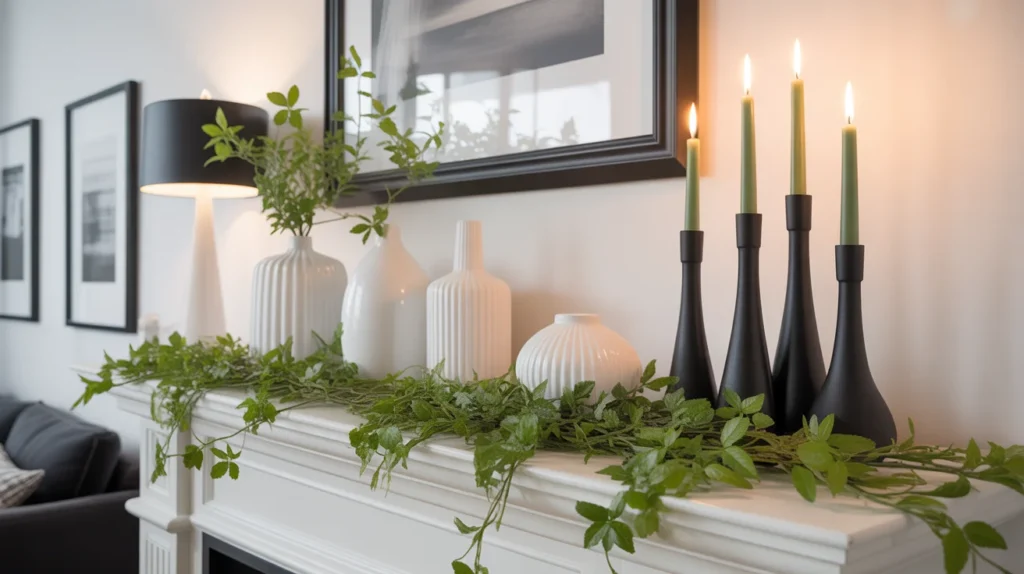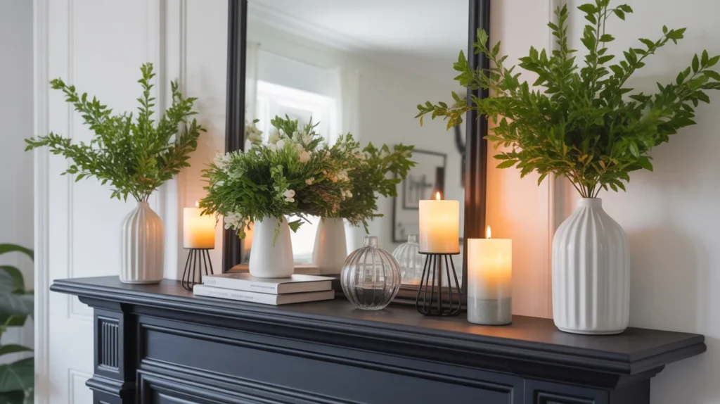 For a crisp and contemporary look, try a black, white, and green summer mantel. This color mix feels bold but still fresh, making it perfect for a modern home. Use black candle holders, white vases, and green stems or leafy branches to create contrast without visual clutter. This trending aesthetic is sleek, stylish, and easy to adapt across many room ideas. It also looks especially striking in Pinterest photos, thanks to its clean lines and high contrast.