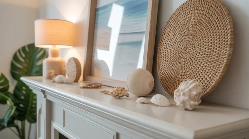 Bring the feeling of a beach house home by styling your mantel with collected natural textures. Think coral-inspired decor, woven accents, light wood, shells, seagrass, and sand-toned ceramics. The goal is to create a relaxed display that feels inspired by the shore without becoming too themed. This decor inspiration is great for summer because it adds warmth, texture, and personality. It also fits beautifully into coastal, boho, or cottage room ideas. Keep the palette soft so the materials stand out.