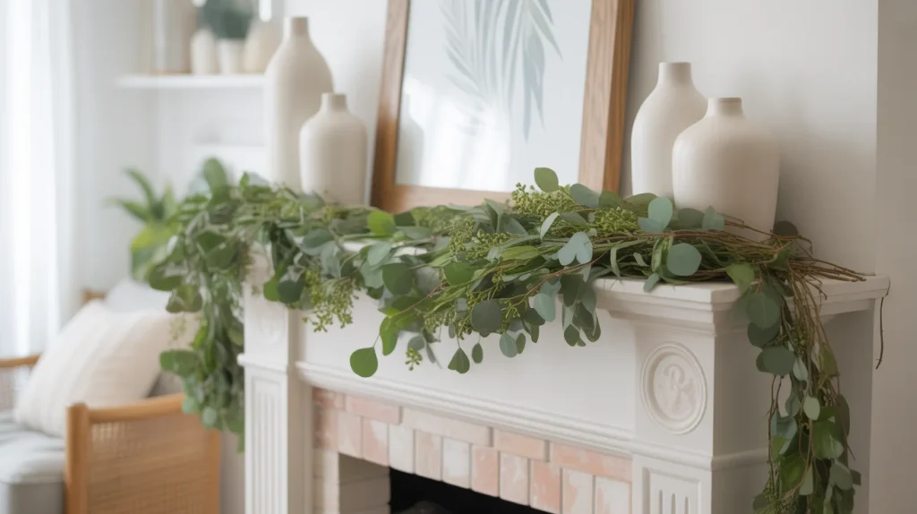 Nothing says summer quite like a mantel filled with natural-looking greenery. Eucalyptus stems, olive branches, and leafy garlands create a soft, relaxed look that feels organic and effortless. This is one of the easiest summer mantel decorating ideas because it works with almost every home style. The green tones bring life to the room while still keeping the look calm and uncluttered. For anyone searching for room ideas with a fresh seasonal feel, greenery is a simple but stylish idea that always photographs beautifully.