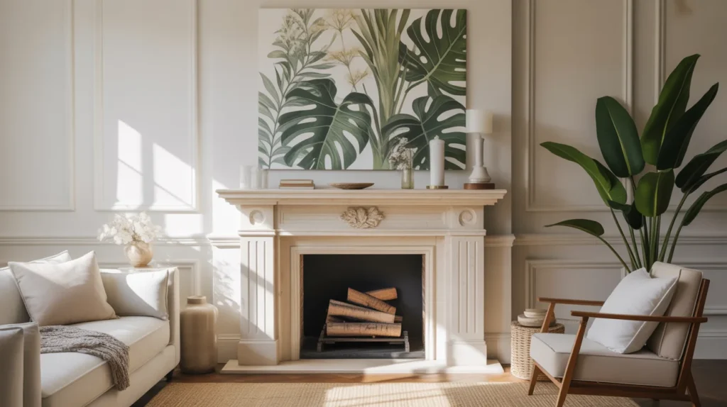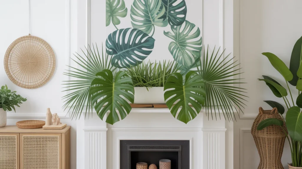 Tropical leaves instantly make a mantel feel lively, lush, and ready for summer. Palm fronds, monstera leaves, and green botanical prints create a bold seasonal statement while still looking polished. This is one of the most playful summer mantel decorating ideas, especially for bright and casual homes. It adds color and movement to the space without requiring many small items. For bold decor inspiration and eye-catching room ideas, tropical greenery creates a fresh, energetic, trending aesthetic.