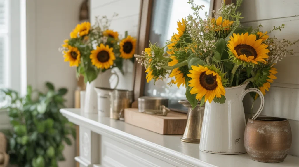 Sunflowers and wildflowers bring instant warmth and happiness to a summer mantel. This style feels cheerful, relaxed, and full of natural beauty, making it perfect for country, farmhouse, or cottage homes. Use a mix of yellow blooms, daisies, and soft greenery in pitchers or rustic vases. The result feels bright and welcoming without trying too hard. This is one of those room ideas that turns your mantel into a sunny focal point and creates decor inspiration that feels both classic and seasonal.