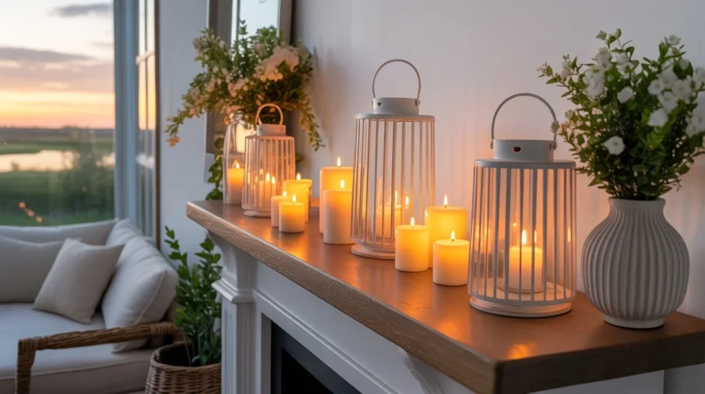 Summer decor can still feel cozy, and candles or lanterns are perfect for adding that warm evening glow. Choose light wood, glass, or white metal lanterns, paired with neutral candles, for a soft, seasonal look. This is one of the easiest, stylish ways to create a welcoming atmosphere without adding too much color. It works beautifully in modern farmhouse, coastal, or classic room ideas. During the day, the lanterns add structure, and in the evening, they make the mantel feel warm and inviting.