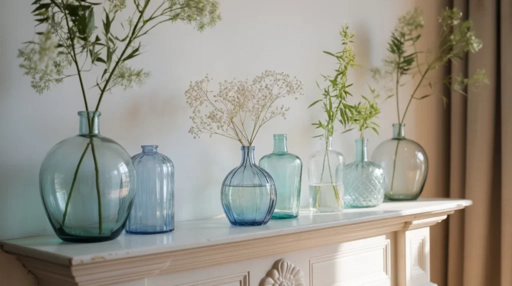 A group of vintage bottles and glass vases can create an effortlessly charming summer mantel. Clear, pale blue, green, or amber glass catches the light beautifully, giving the display a collected, airy feel. This look is especially lovely in cottage, farmhouse, or vintage-inspired spaces. It is subtle, stylish, and full of character, requiring little color. This decor inspiration also works well for those who want a lighter seasonal update that still feels personal and visually layered.