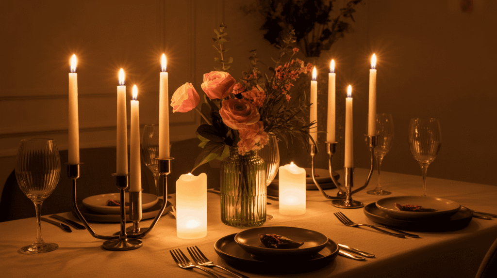 Layer different candle heights using taper candles, votives, and pillar candles to add depth and visual interest. Keep the table setting simple with clean plates, minimal décor, and neutral tones so the candlelight remains the main focus. The warm glow creates romantic shadows that instantly set a calming and emotional mood.