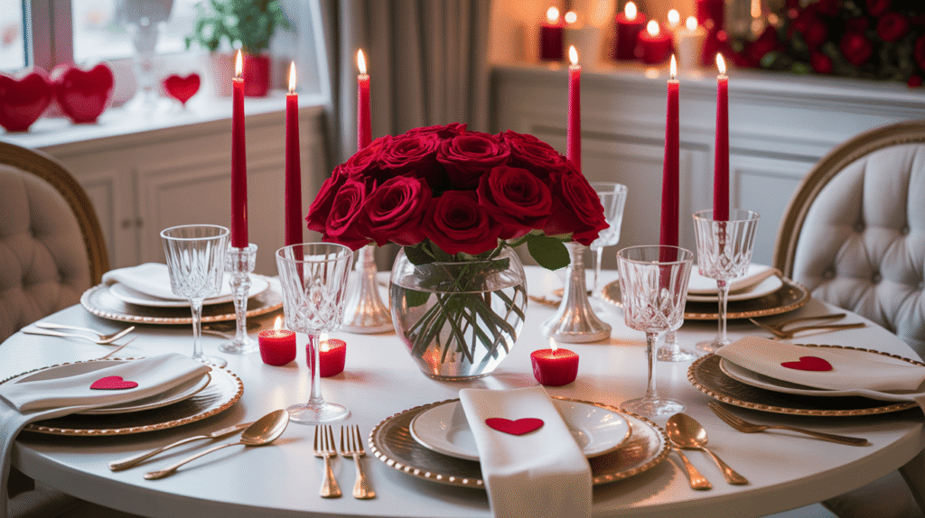 Start with crisp white linens as the base to keep the table looking clean and refined. Add red roses as the centerpiece to bring in a strong romantic focal point. Candles in glass holders or tapered styles create a warm glow that enhances intimacy and sets the mood for a special evening. Elegant place settings with polished cutlery, crystal glassware, and subtle heart-shaped accents complete the look.