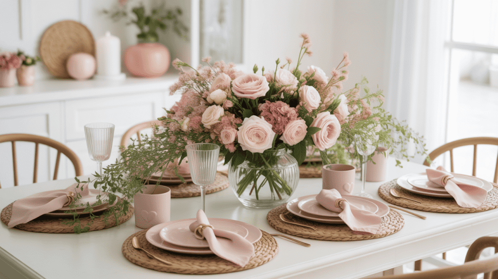 A floral-focused Valentine tablescape places natural beauty at the heart of the celebration. Fresh or dried flowers instantly bring life, color, and romance to the table, creating a visually stunning and welcoming setting. This style feels both elegant and organic, perfect for a meaningful Valentine meal.