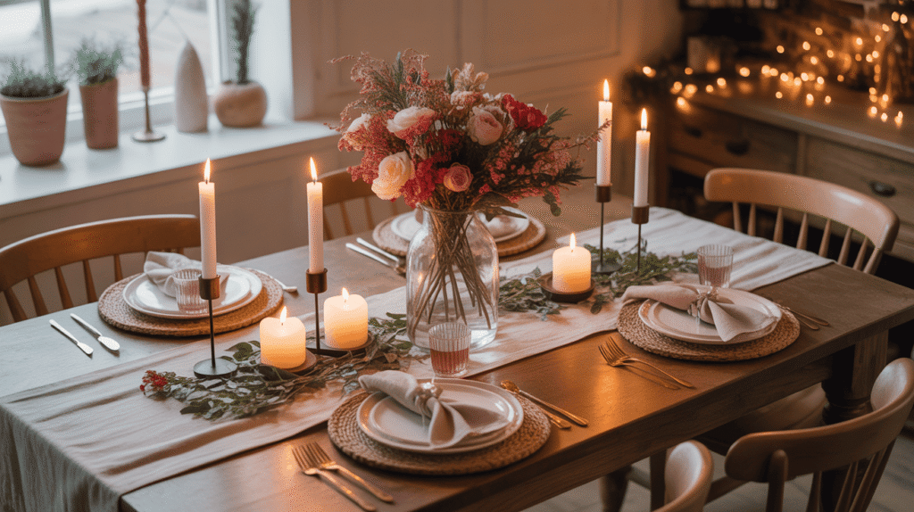 This intimate tablescape proves that less can truly be more. With thoughtful candle placement and subtle styling, it transforms a simple dinner into a memorable and heartfelt Valentine celebration.